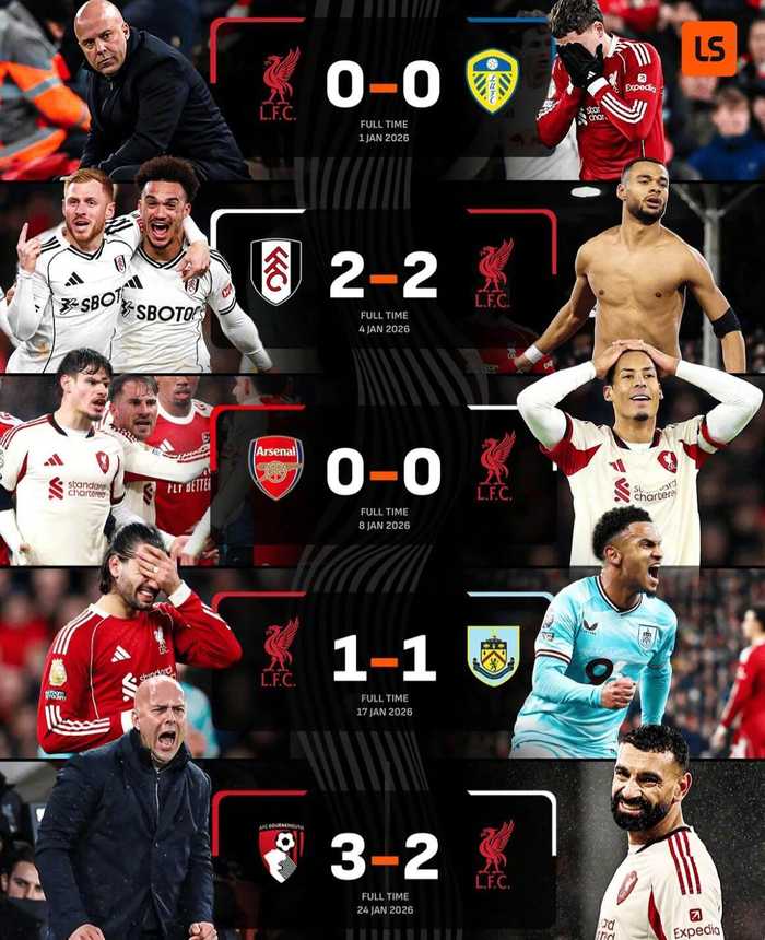 #伯恩茅斯3比2利物浦# 进入2026年后,利物浦联赛先后0-0利兹联、2-2富勒姆、0-0阿森纳、1-1伯恩利,随后又在伯恩茅斯身上丢掉到手的1...