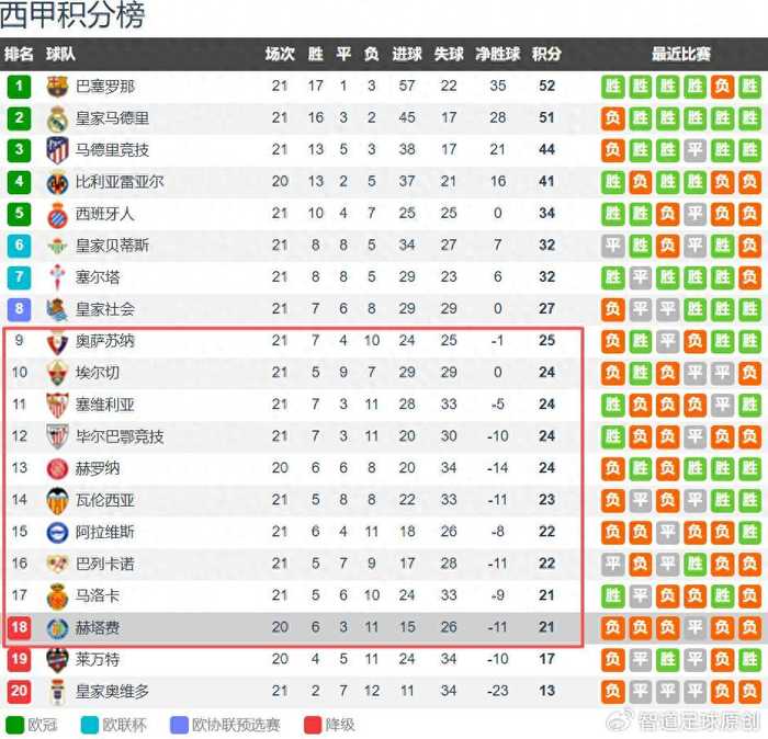 西甲本赛季已经战罢21轮,你能想得到吗?过半球队在忙着保级,这意味着西甲下半区的球队,甚至是上半区排名靠后两队都有降级的危机,...