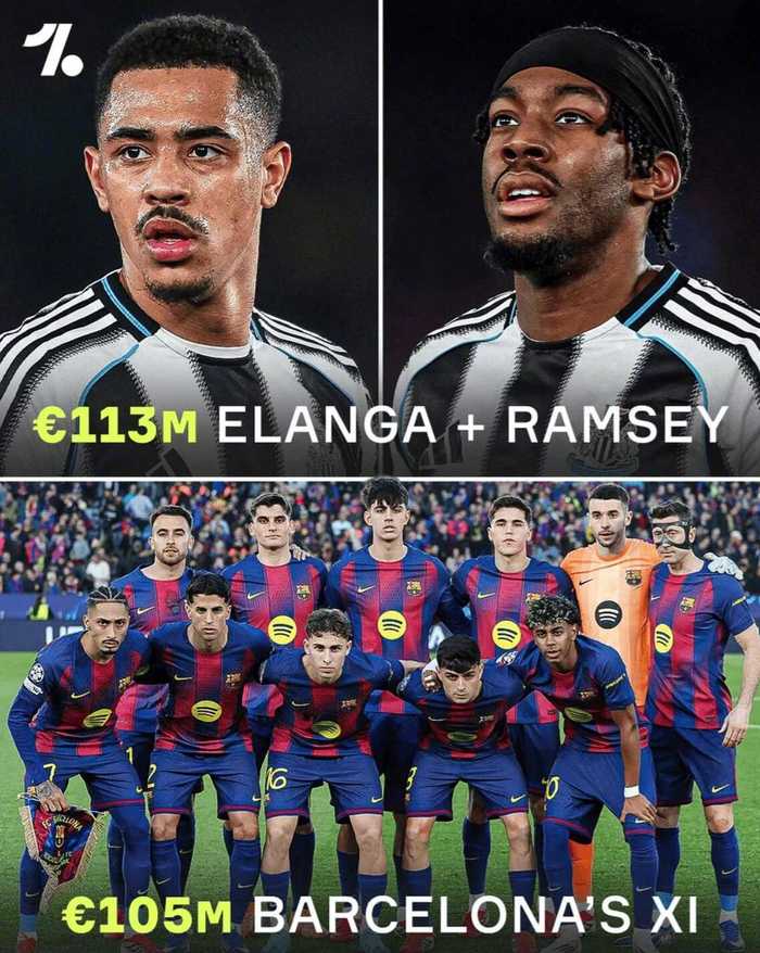 欧冠1/8决赛次回合,巴萨主场7比2大胜纽卡斯尔,总比分8比3晋级八强。 赛后OneFootball晒出对比图:本场巴萨首发11人的总转会费约...